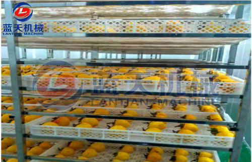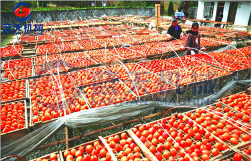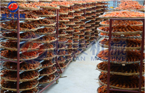 4:第一次烘烤 柿果進(jìn)入柿餅烘干機(jī)后,迅速升溫至40——50°c,使柿果內(nèi)乙醇脫氫酶活性處于最高狀態(tài)。內(nèi)呼吸也加強(qiáng),借以快速完成軟化,脫澀和部分脫水(25%左右),持續(xù)時間約12h,視柿果大小,成熟度靈活掌握。干燥柿餅時,防霉十分關(guān)鍵,稍有不慎,即會在幾個小時內(nèi)造成整個烤房中的柿果霉?fàn)€損失。因此,需要使烤房內(nèi)的相對濕度始中保持在70%以下,可有效防止柿果霉變。