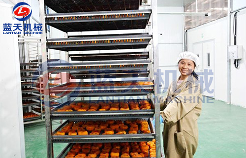 6:第2次烘烤 將捏過的柿果,再次送入烤房,升溫至45——50°,持續(xù)15H左右,使柿果再次快速脫水35%。