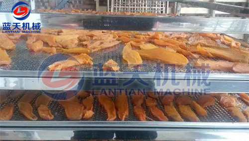 2、在切片環(huán)節(jié)中,首先要保證厚度一致,其次,盡量不讓紅薯片的規(guī)格相差太大。在這些工序完成之后,在將切好的紅薯片放入擺放物料的架子上。做到厚度均勻、擺放整齊。