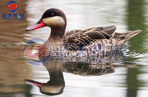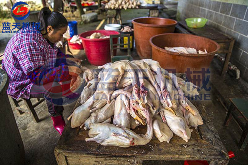鴨只屠殺之前應(yīng)予12~24小時(shí)絕食,并給以充分清水,使之安靜休息。如此可使屠殺放血良好,并可減少未完全消化的飼料污染屠體的機(jī)會(huì)。經(jīng)屠殺后,將屠體外表洗凈,祛除余毛,并應(yīng)即速冷卻。鴨之屠體選用無(wú)骨折及瘀血斑點(diǎn)者,并將鴨只在肘關(guān)節(jié)及跗關(guān)節(jié)下端分別將兩翅及兩腳去掉。以左手抓住鴨之下額骨,右手持刀從口腔割掉帶舌的下額部,此處理俗稱(chēng)割外五件。