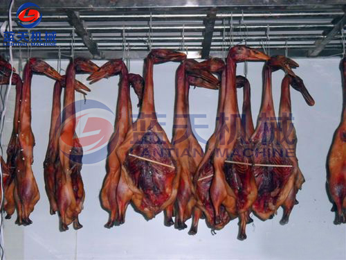 將擦干之鴨體加以整型,將其掛入竹杠上,放入空氣能板鴨烘干房。以空氣能板鴨烘干機(jī)為例設(shè)置烘干參數(shù),首先45~50℃熱風(fēng)干燥約6小時(shí)后,移置于約15℃冷風(fēng)處冷卻5~8小時(shí),使鴨體定型,并可使皮膚出現(xiàn)乳白色,如用一次烘干時(shí),則皮膚易變暗褐色,外觀(guān)不良。冷卻后之鴨只再以45~50℃熱風(fēng)干燥。