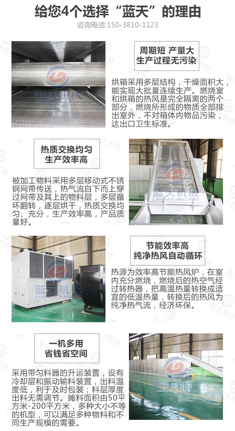 可烘干產(chǎn)量大:可大批量24小時(shí)連續(xù)式烘干處理,日加工產(chǎn)量可達(dá)到幾十噸,適合集中化烘干加工模式;