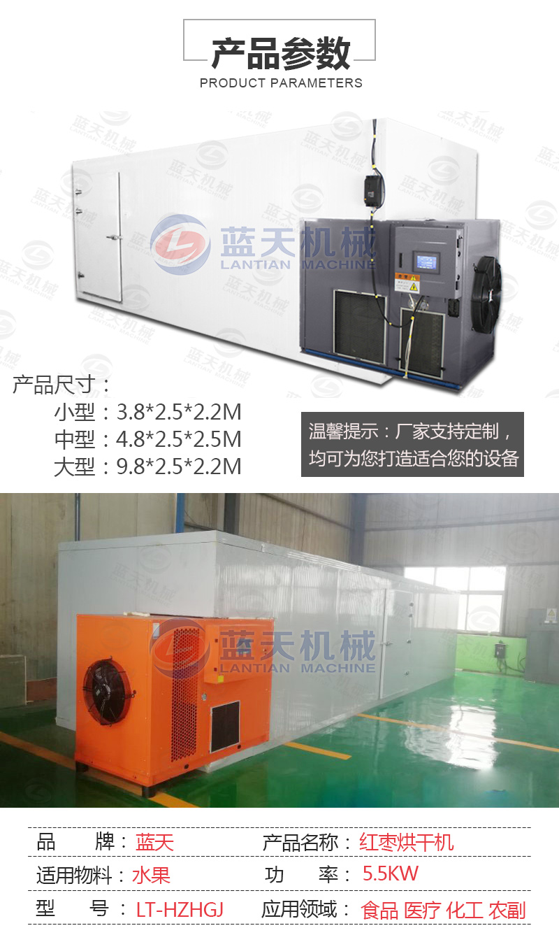 紅棗烘干機(jī)采用空氣能熱泵來(lái)烘干紅棗等農(nóng)產(chǎn)品很合適,機(jī)器綠色環(huán)保節(jié)能,使用電能要比電熱管烘干箱烘烤設(shè)備少30%-40%。