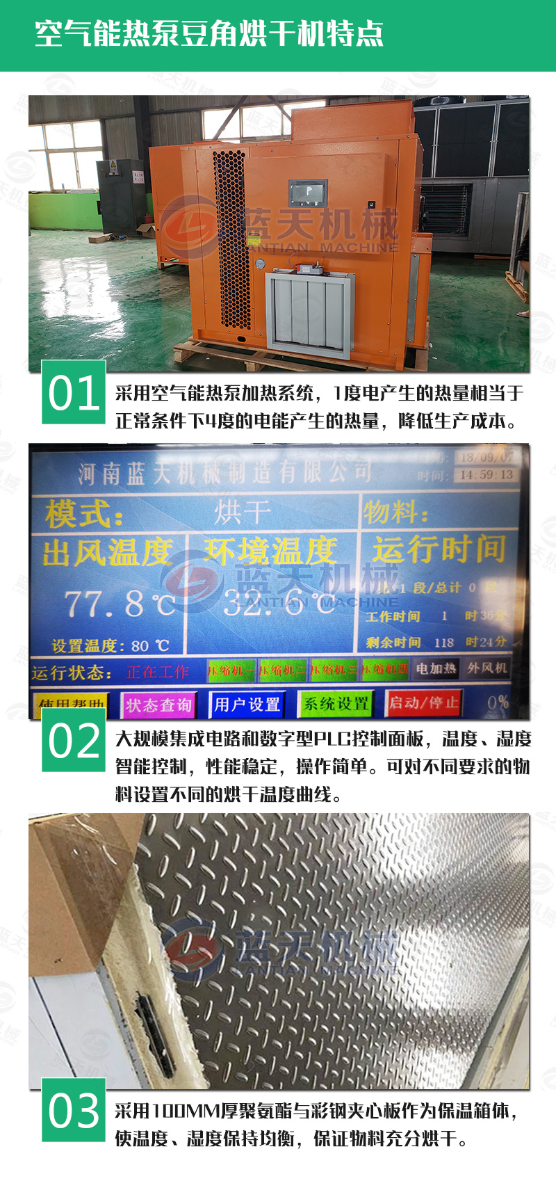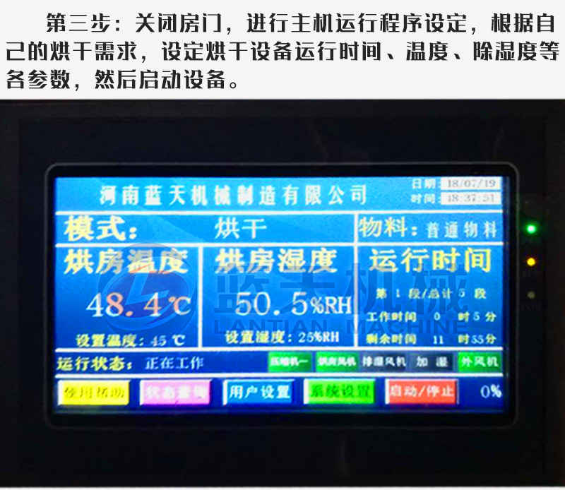 三:將盛放好豆角的物料車推入豆角烘干機(jī)設(shè)備內(nèi),關(guān)閉房門,進(jìn)行主機(jī)運(yùn)行程序設(shè)定,根據(jù)自己的烘干需求,設(shè)定烘干設(shè)備運(yùn)行時(shí)間、溫度、除濕度等各參數(shù),然后啟動(dòng)設(shè)備。