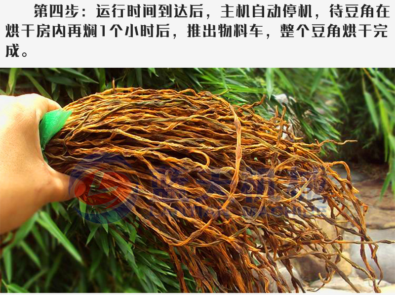 四:運(yùn)行時(shí)間到達(dá)后,主機(jī)自動(dòng)停機(jī),待豆角在豆角烘干機(jī)內(nèi)再燜1個(gè)小時(shí)后,推出物料車,整個(gè)豆角烘干完成。