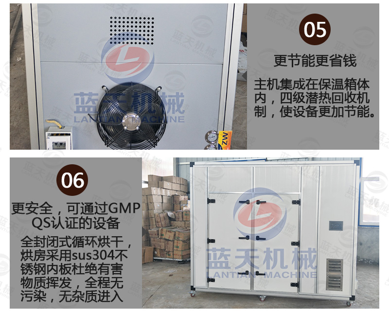 (1)能耗費用低——野生蘑菇烘干機采用加熱模式是熱泵空氣能,烘干機在運行中能回收外界環(huán)境中濕熱空氣的顯熱和潛熱,能量得到足夠而合理利用,是一種公認的效率高節(jié)能設備。比傳統(tǒng)的柴油鍋爐干燥房、電熱烘干房,煤鍋爐都節(jié)能。